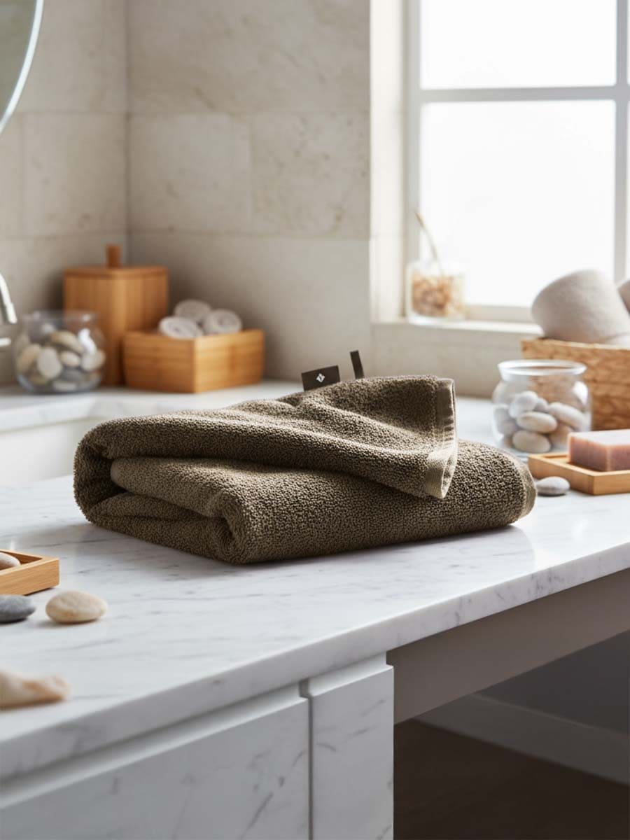Telo doccia Vegan Life Vossen Daunenstep realizzato esclusivamente in cotone vegano e con finissaggi di origine vegetale.