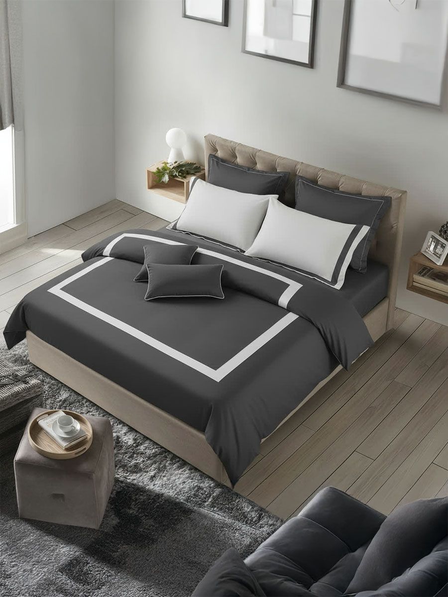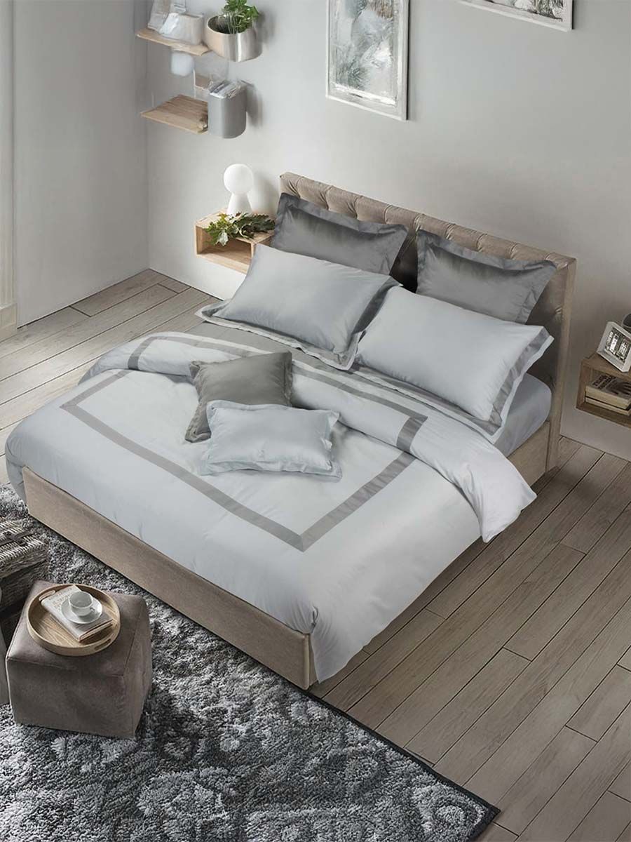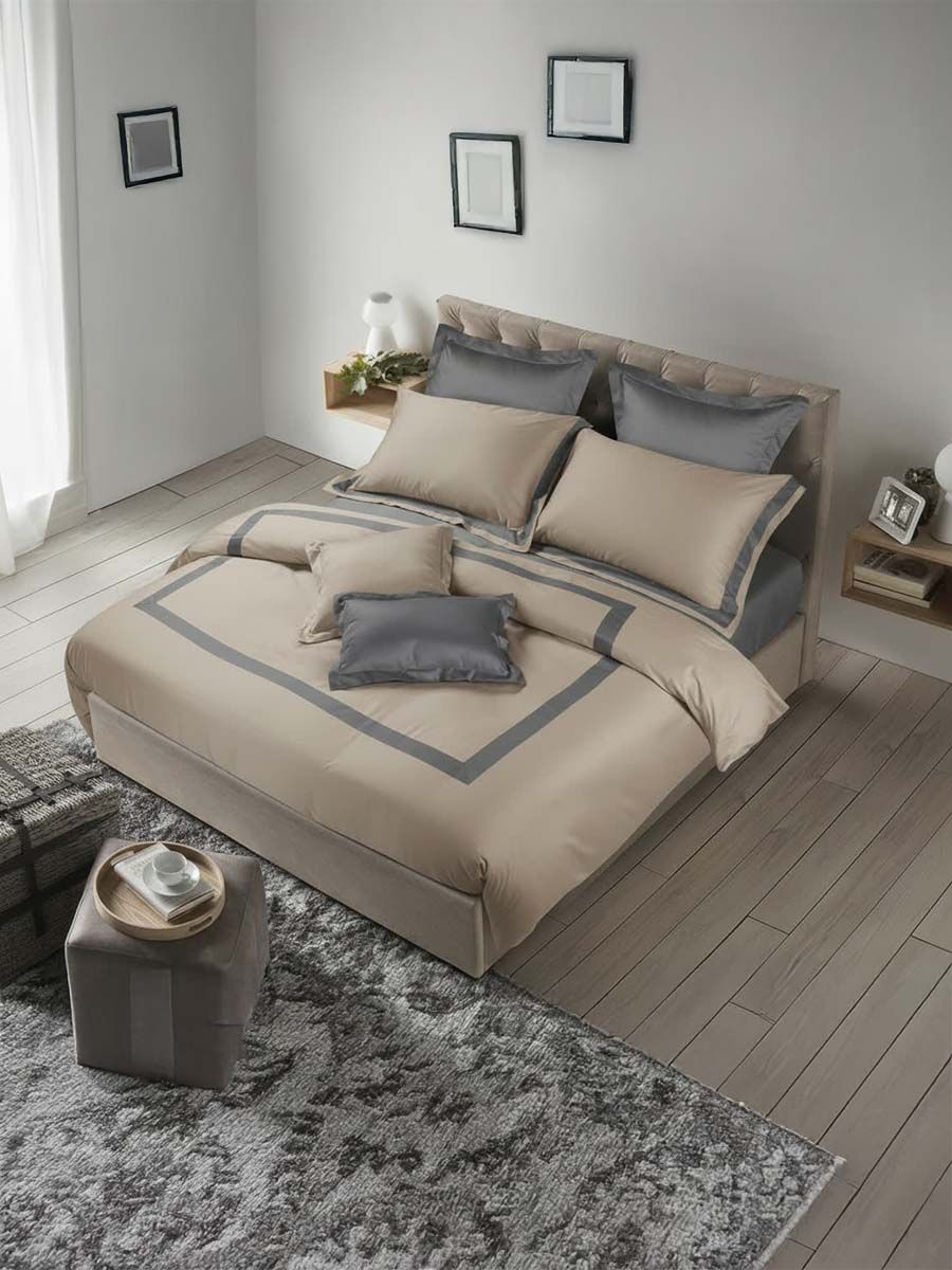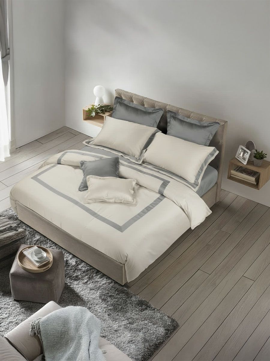 Il sacco copripiumino è impreziosito da una balza decorativa che incornicia elegantemente il letto, mentre le federe sono bordate su tre lati per un effetto armonioso e curato. Il lenzuolo inferiore con elastico perimetrale garantisce una vestibilità perfetta anche sui materassi più alti o leggermente fuori misura.