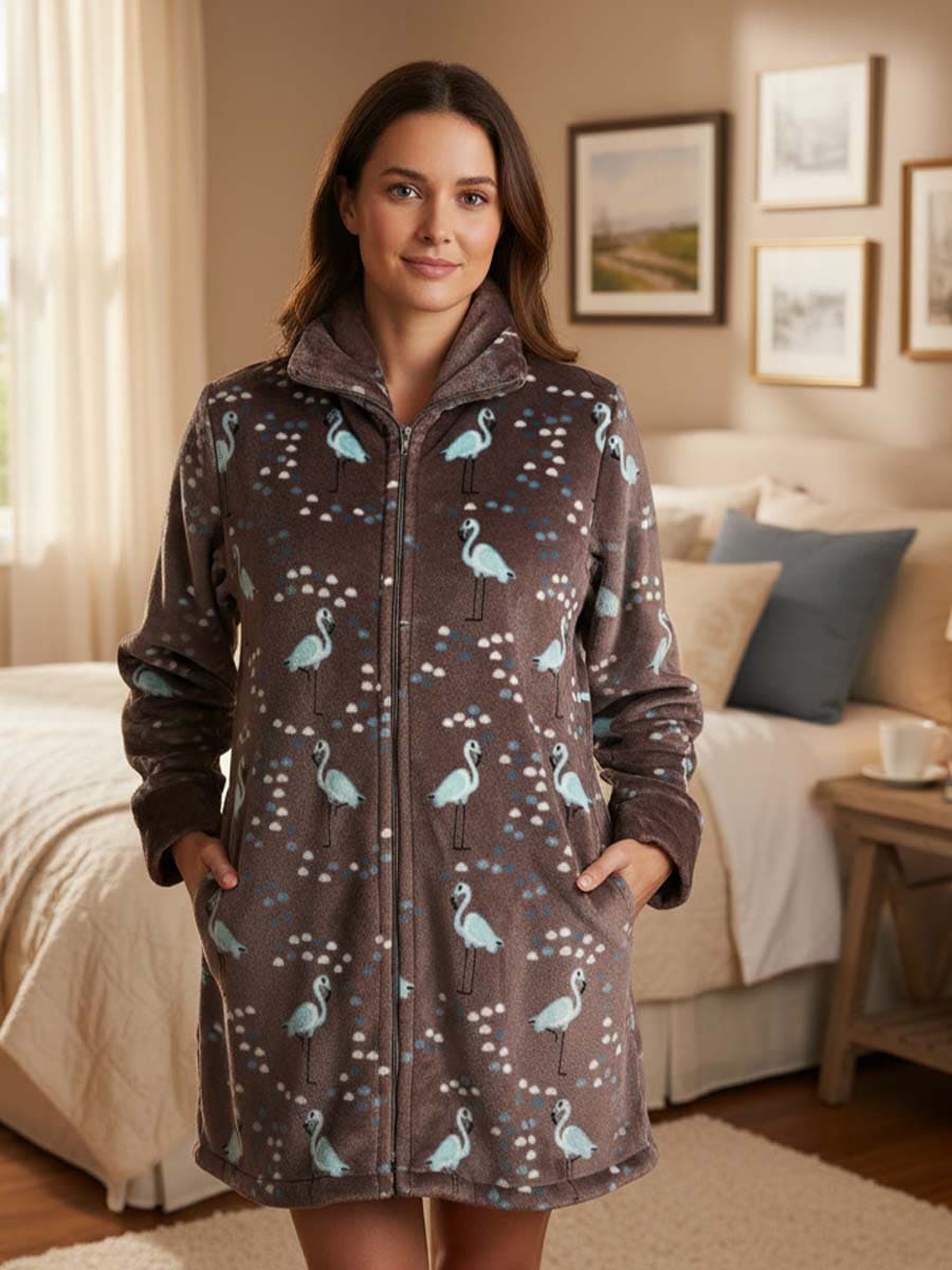 La vestaglia da donna Funny è prodotta da Daunex con soffice e caldo tessuto di pile “flannel” cinigliato incredibilmente morbido ed avvolgente stampato con simpatici disegni. Pratica ed elegante, grazie alla sua cerniera frontale, si indossa in un attimo come una tuta ed è lunga fino alle ginocchia.