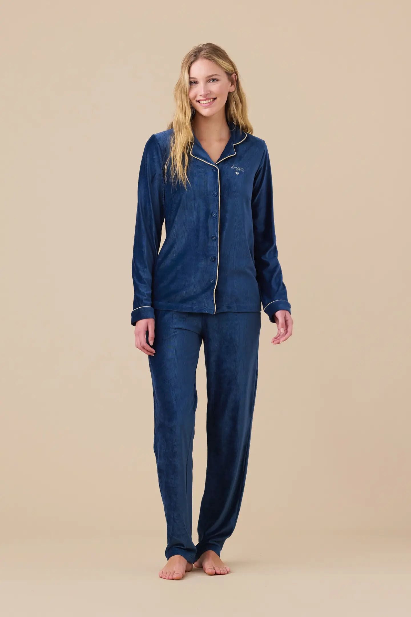 Il top con abbottonatura frontale e piping a contrasto dona un tocco elegante e raffinato, mentre la scritta ricamata sul petto aggiunge un dettaglio femminile e delicato. I pantaloni con tasche laterali completano il look, pratici e confortevoli per il relax quotidiano.