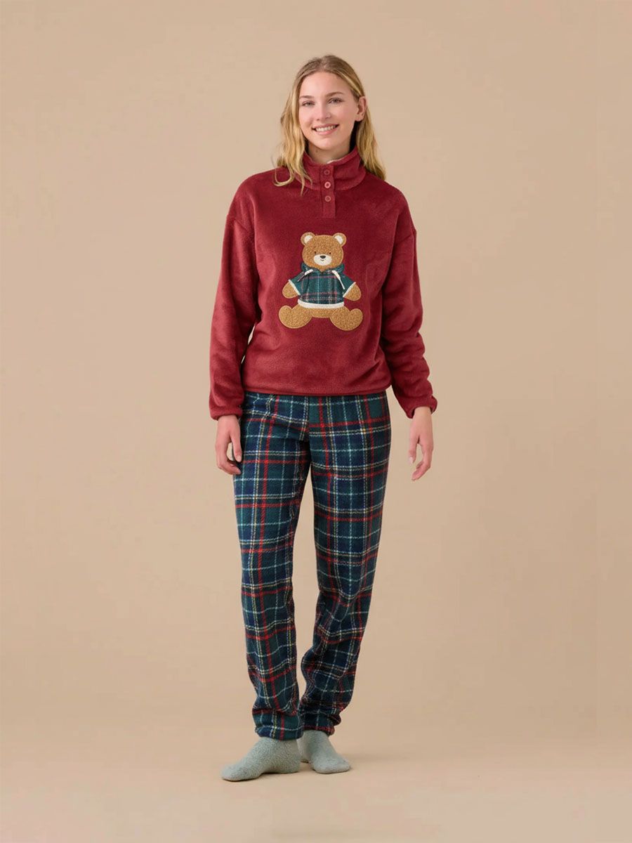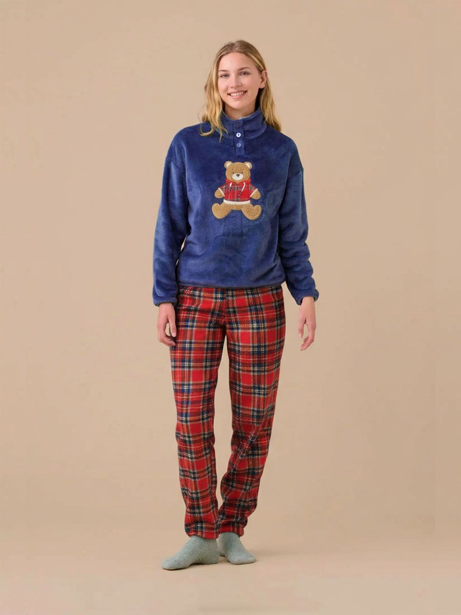 Pigiama Donna Coral Articol Orsacchiotto di Noidinotte è caldo ed avvolgente. Il top unito è realizzato con collo alto a tre bottoni e dolce applicazione a orsetto sul davanti. I pantaloni presentano una stampa scozzese con pratici polsini alla caviglia per il massimo comfort. Perfetto per le serate più fredde, unisce stile e comodità.