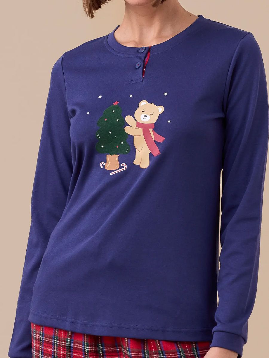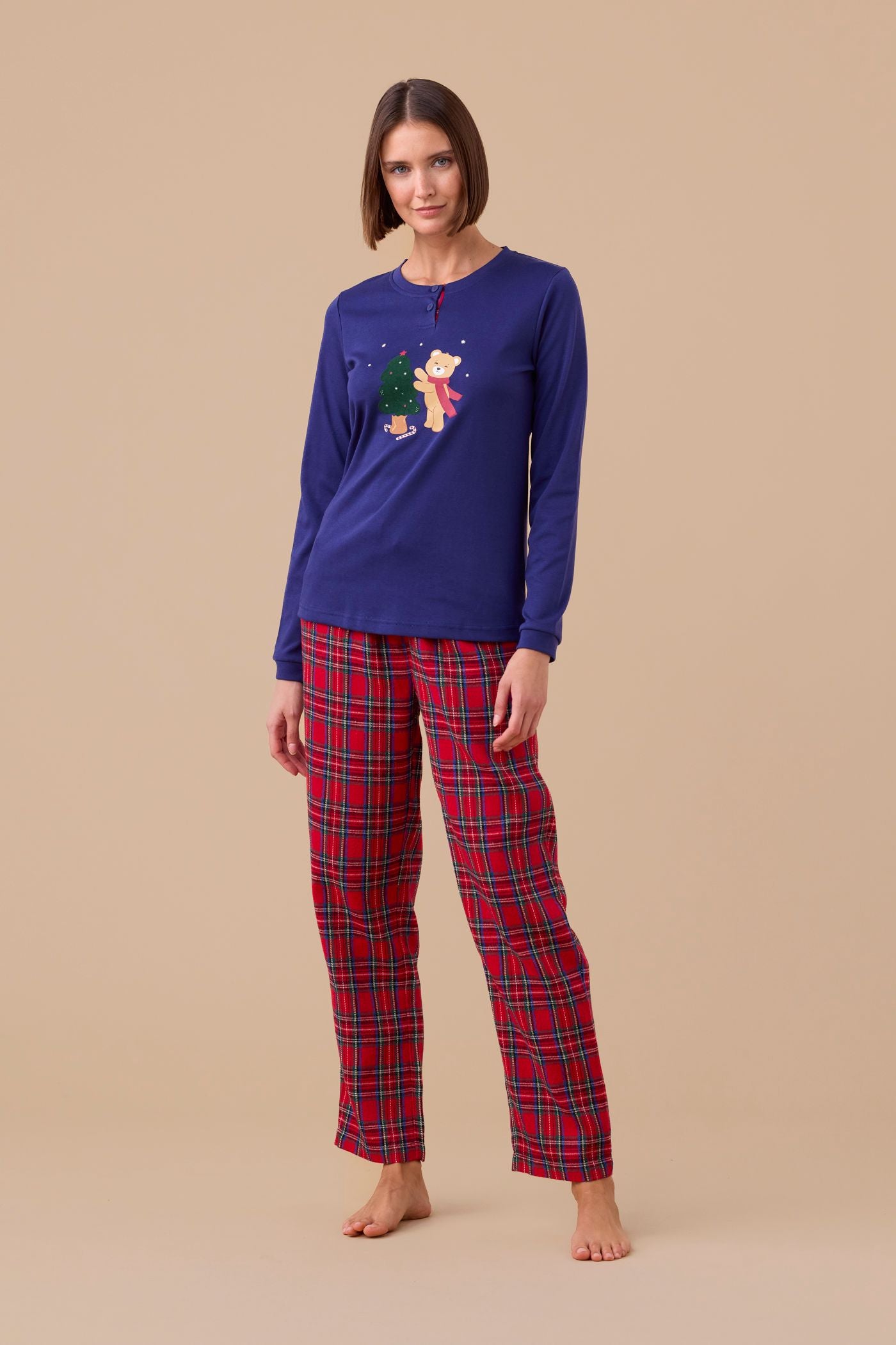 Il Pigiama Donna in Caldo Cotone Articolo Christmas Tree di Noidinotte è pensato per garantire comfort, morbidezza e calore nelle giornate più fredde. Il top, a tinta unita, presenta un collo a due bottoni con stampa centrale discreta, mentre i pantaloni in flanella scozzese donano un tocco classico e intramontabile. Con vestibilità comoda, è ideale per il relax quotidiano e le serate invernali.
