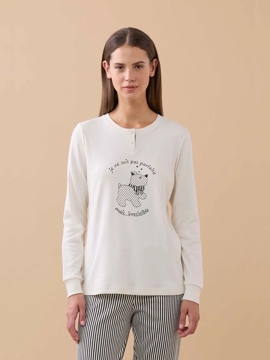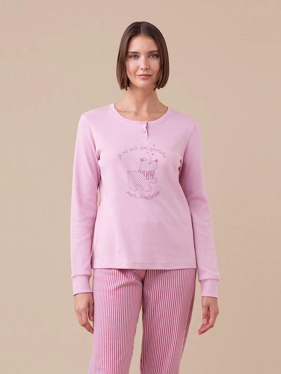 Scopri il comfort e la dolcezza del Pigiama donna invernale in caldo cotone articolo dog di Noidinotte ideale per le notti più fredde. Il top con due bottoni sullo scollo è impreziosito da un simpatico disegno di un cagnolino applicato sul davanti, per un tocco tenero e divertente. I pantaloni con polsini sul fondo garantiscono una vestibilità perfetta e il massimo comfort durante il riposo.