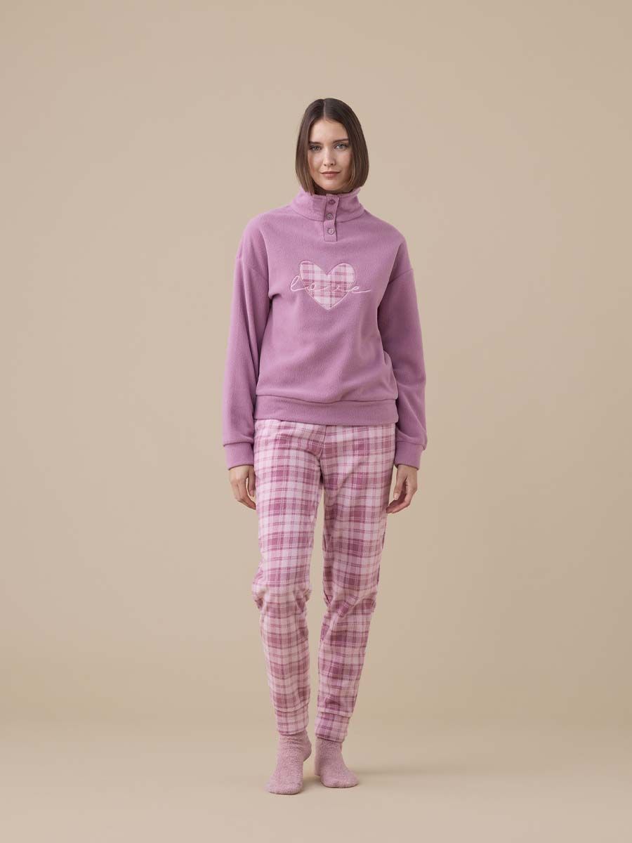 Pigiama Donna Micropile Articolo Cuoricino di Noidinotte è un comodo e caldo, perfetto per affrontare le fredde notti invernali. Il top a collo alto con tre bottoni unisce praticità e stile, arricchito da un dolce cuore applicato sul davanti. I pantaloni con stampa scozzese e polsini sul fondo completano il look, offrendo una vestibilità confortevole e una nota elegante. Ideale per chi desidera calore, comfort e un tocco di romanticismo anche a casa.
