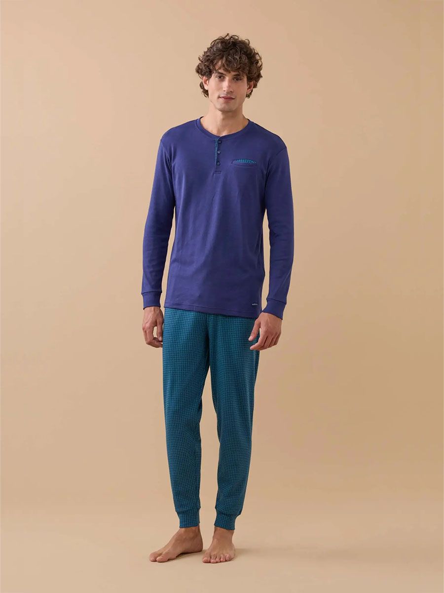 Il Pigiama Uomo Invernale in Caldo Cotone Articolo Pull Noidinotte unisce praticità e stile per le serate più fredde. Il top di colore unito con collo a tre bottoni offre un look semplice e confortevole, mentre i pantaloni con stampa pied de poule e polsini sul fondo aggiungono un tocco elegante e moderno. Ideale per chi desidera comfort e raffinatezza anche nei momenti di relax.