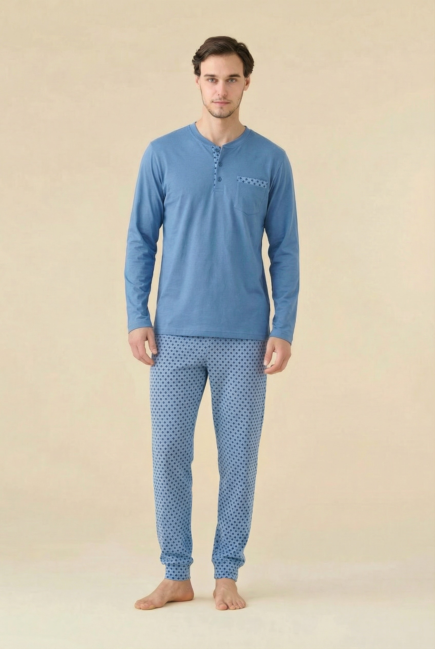 Il Pigiama Uomo in Jersey di Cotone con Manica Lunga di Noidinotte è pensato per garantire comfort, morbidezza e libertà di movimento durante il riposo. Realizzato in jersey di cotone, un tessuto naturalmente elastico e traspirante, offre una vestibilità confortevole e una piacevole sensazione sulla pelle.