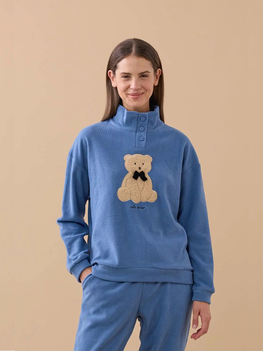 Il Pigiama Donna Micropile Articolo Orso di Noidinotte è morbido e avvolgente, questo pigiama da donna è realizzato in caldo micropile 100% poliestere, ideale per affrontare le serate più fredde con comfort. Il top, a tinta unita, presenta un collo a tre bottoni e una graziosa applicazione con orso e fiocco in velluto, che aggiunge un tocco dolce e femminile. I pantaloni con polsini sul fondo assicurano una vestibilità comoda e pratica, mantenendo il calore durante tutta la notte. COMPOSIZIONE