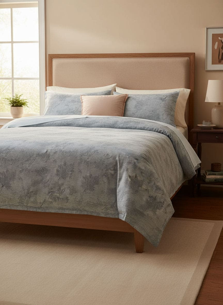 Il tono blu, sobrio e raffinato, richiama l'armonia e la serenità di paesaggi incantevoli, mentre la trama jacquard, che evidenzia dettagli e sfumature, rende ogni lato del copripiumino un'opera d'arte tessile. La qualità dei materiali utilizzati garantisce una sensazione di morbidezza al tatto e una durata nel tempo, permettendo di mantenere la bellezza del tessuto anche dopo numerosi lavaggi. Perfetto per chi cerca un tocco di lusso e comfort, il Copripiumino Matrimoniale Landscape Blu è l'elemento ideale per un ambiente elegante e rilassante.