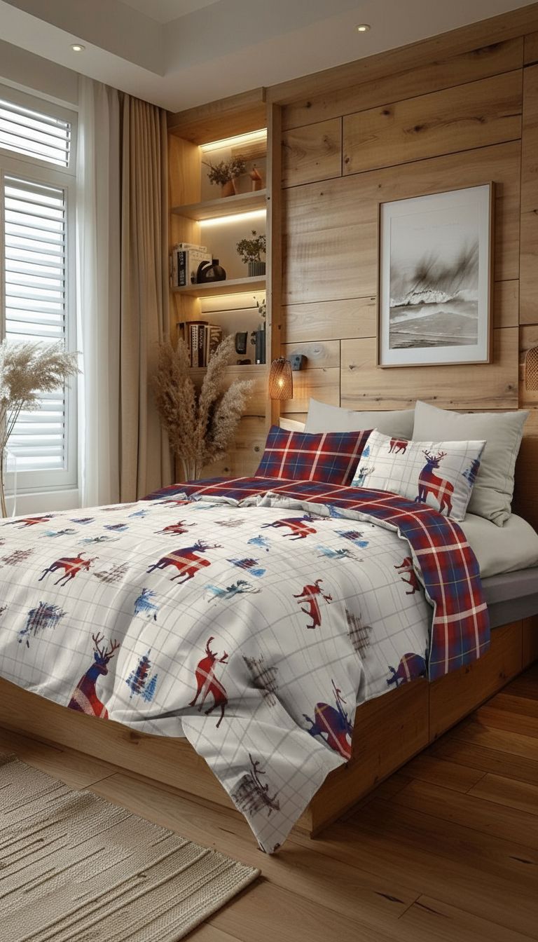 Dal tocco fresco e morbido, la parure è caratterizzata da quadri ognuno adornato da una stampa a tema invernale da un lato del sacco, l'altro lato è scozzese.