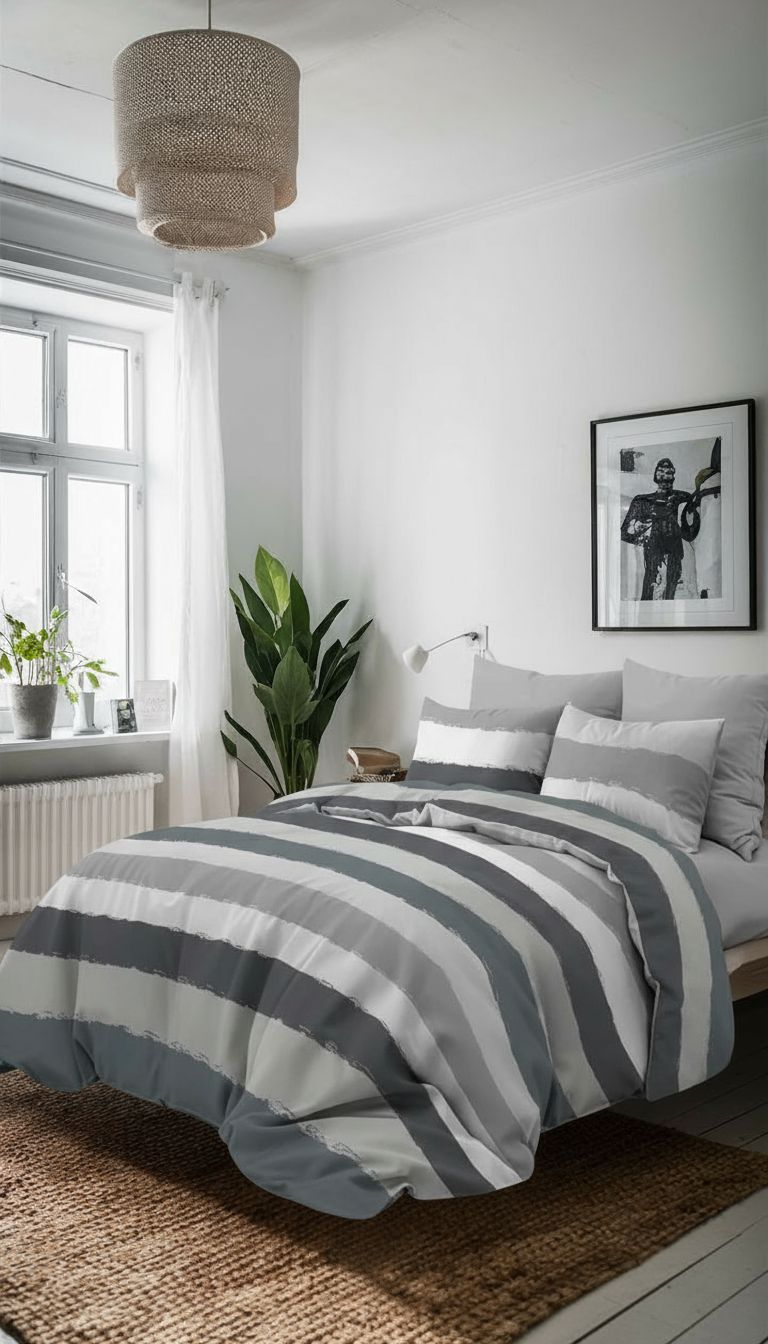Fresco, morbido e facile da stirare. Presenta una stampa geometrica a righe leggermente irregolari che sembrano pennellate. Questa moderna fantasia è adatta ad ogni tipo di Arredo Camera.