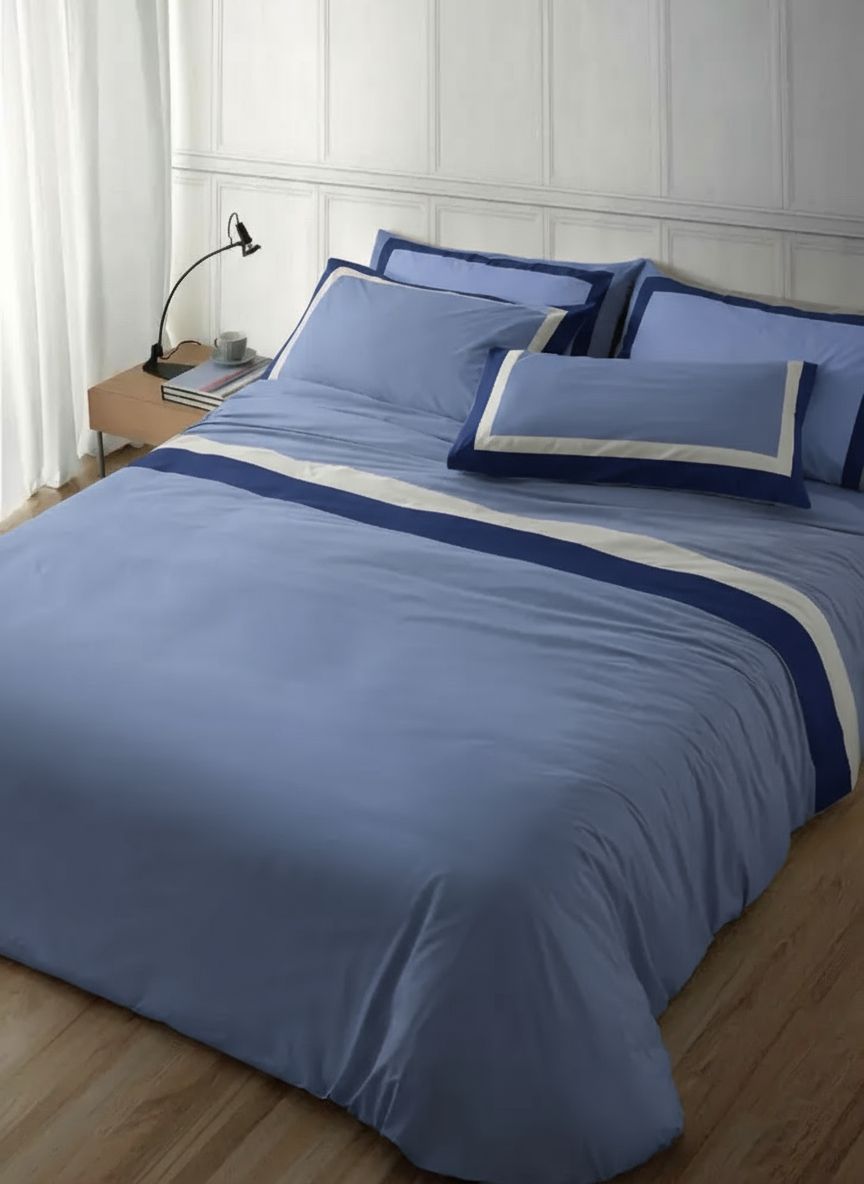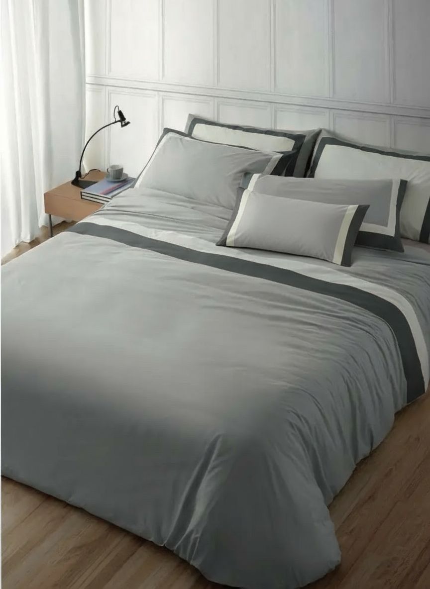La parure include sia il sacco copripiumino matrimoniale che le federe coordinate, pensate per offrire un look armonioso e curato in ogni dettaglio. Il doppio bordo, presente su entrambi gli elementi, conferisce un ulteriore accento di eleganza, rendendo questa parure perfetta per chi desidera un letto impeccabile e chic.