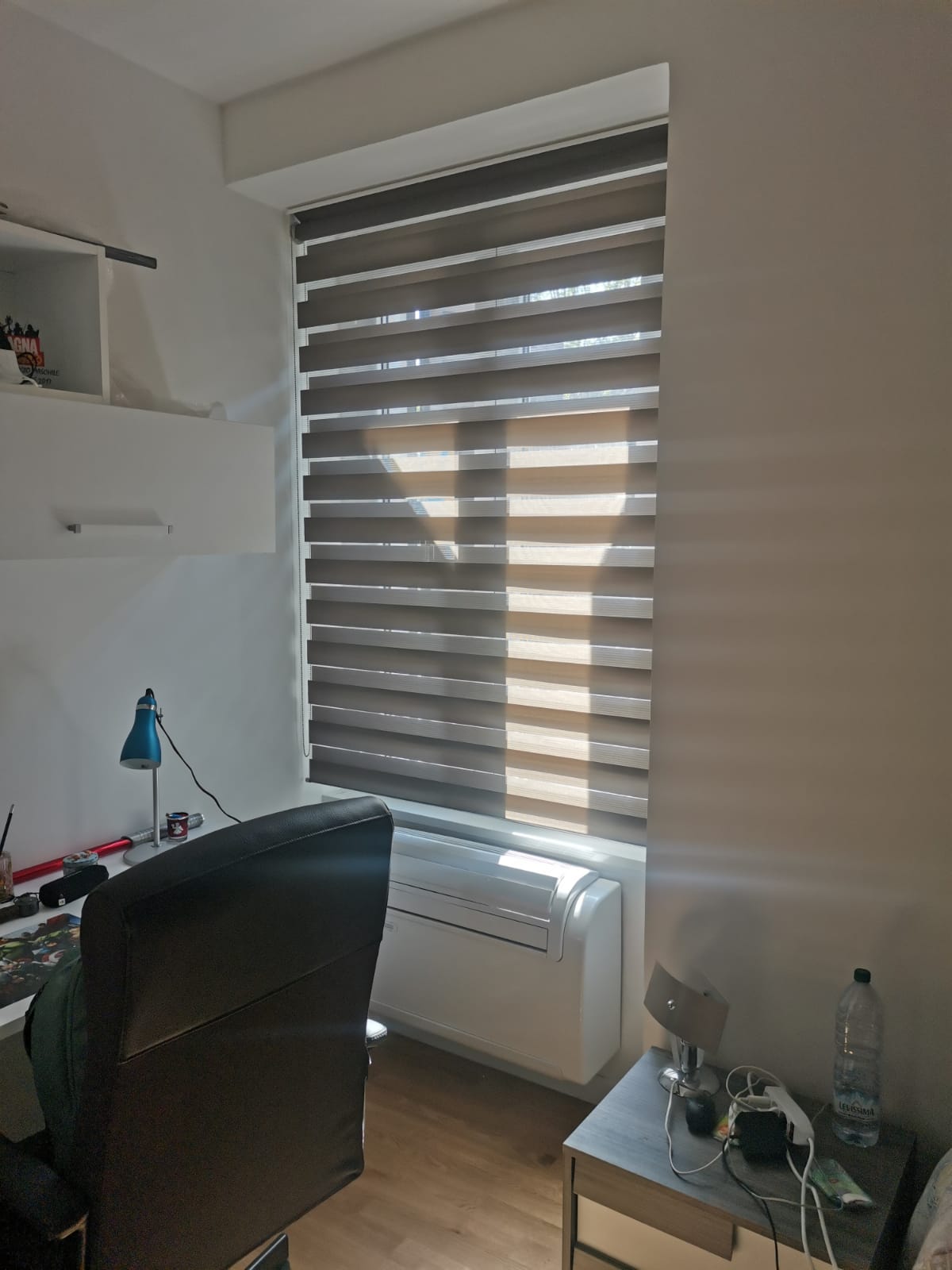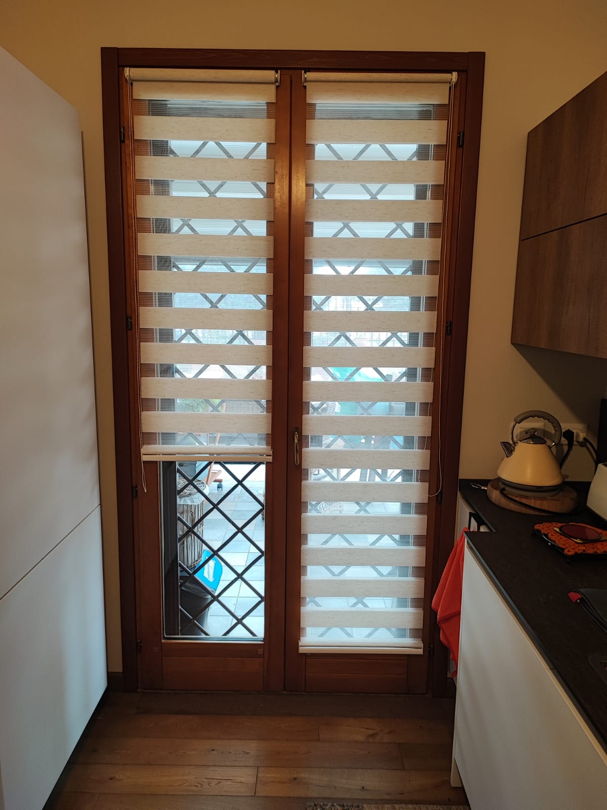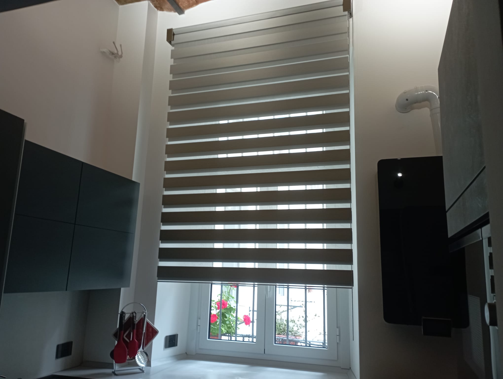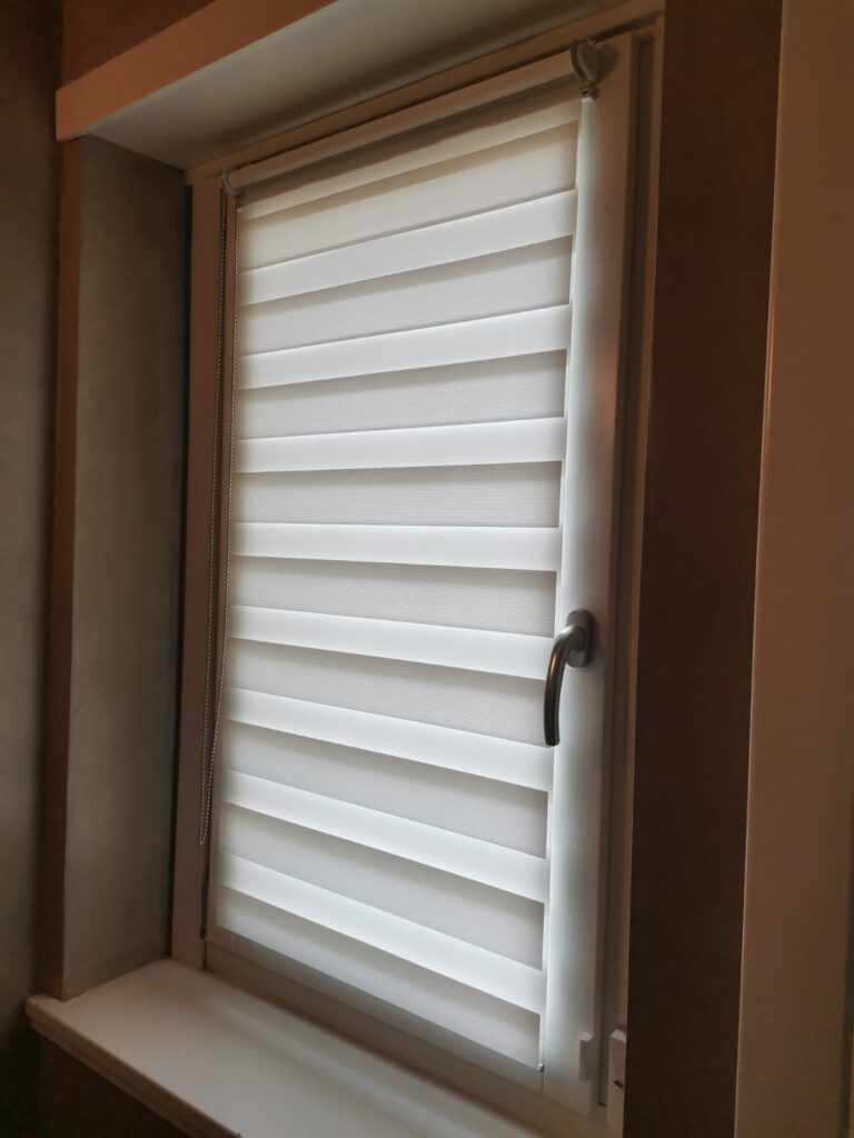 Queste tende sono composte da strisce orizzontali alternate di tessuto trasparente e opaco, montate su un unico sistema di avvolgimento.